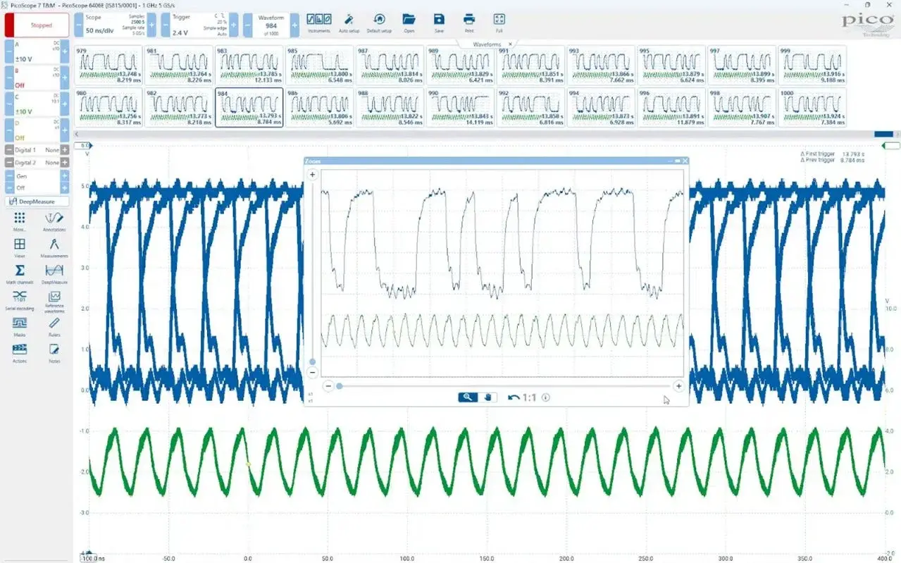 PicoScope 7.2 đánh dấu sự thay đổi rõ rệt trong triết lý hiển thị dữ liệu. Waveform Overlays cho phép chồng nhiều dạng sóng lên nhau để tạo vùng bao tín hiệu, giúp kỹ sư nhanh chóng nhận diện các sai lệch nhỏ, nhiễu ngẫu nhiên hoặc jitter rất thấp – những yếu tố khó phát hiện nếu chỉ quan sát từng lần đo riêng lẻ.